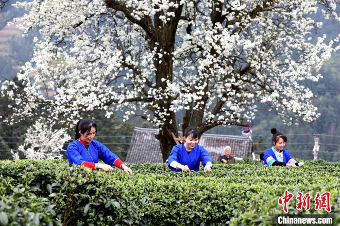 3月2日,广西柳州三江侗族自治县八江镇归令村的梨花竞相绽放,与茶园中嫩绿的茶叶相互映衬。当地村民在茶园中忙碌采摘春茶,与花为伴。