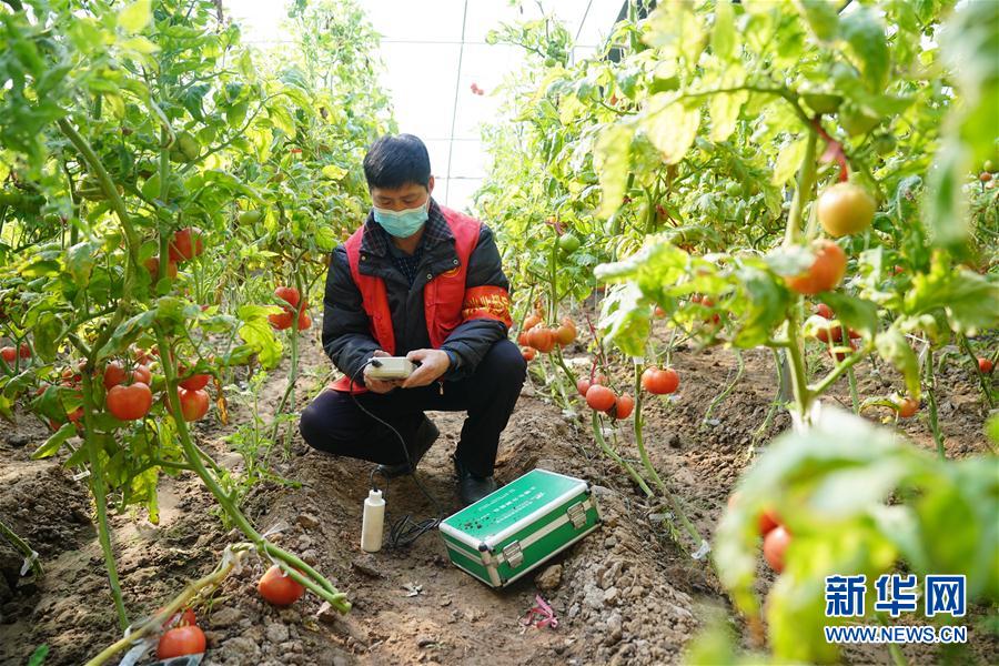 3月3日,农业技术人员在河北邢台经济开发区东北流村的大棚内进行土壤检测。 新华社记者 牟宇 摄