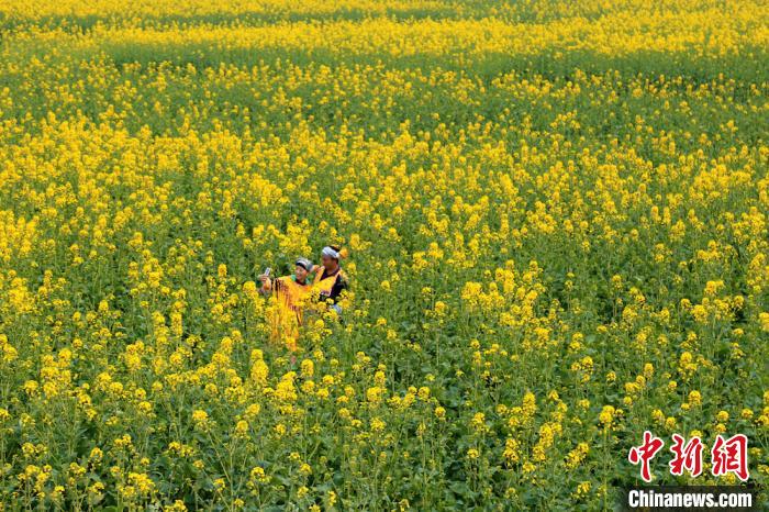 油菜花开春色满园,苗族同胞花田赏花。 张德俊 摄