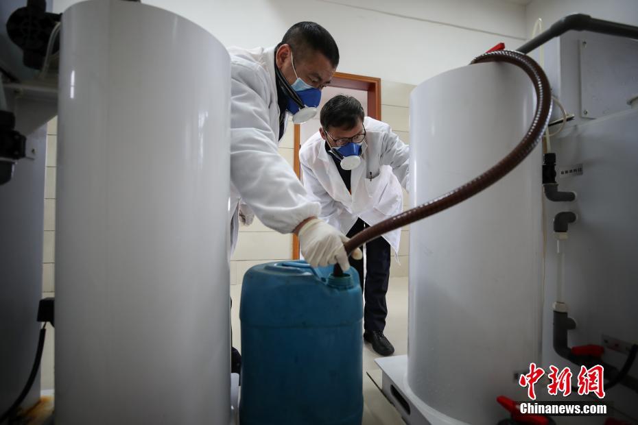 3月3日,两名管道工在二氧化氯发生器里添加相关消毒液体进行二次消毒。中国铁路成都局集团有限公司贵阳供电段有一支特殊的队伍,是其管辖的管道工和水质化验工,他们主要负责贵州省贵阳北、贵阳东高铁枢纽一带管道维护和水质检测工作。新冠肺炎疫情防控期间,10名管道工加班加点,对管辖区域内104公里供水管道、2座给水所、8座蓄水池进行维护;2名水质化验工对各点采样的水质进行逐一检测,确保出行旅客饮水安全。 中新社记者 瞿宏伦 摄