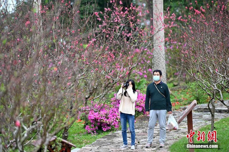 3月3日,广西南宁市青秀山风景区内,桃花连片绽放,民众错峰赏花。近日,广西多地景区陆续开放,为避免人流集中,不少市民选择在工作日前往景区游玩。图为市民拍摄桃花。 中新社记者 俞靖 摄
