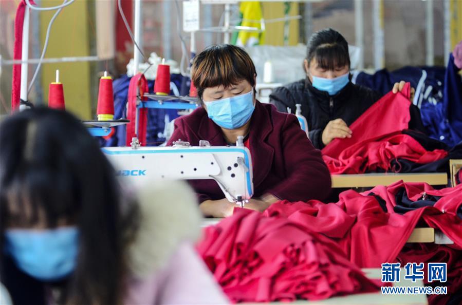 3月3日,在河南省驻马店市汝南县老君庙镇小方村扶贫“微车间”,工人在加工校服。 近日,多地企业在做好疫情防控工作的基础上组织工人有序复工,抓紧生产。 新华社发(孙凯 摄)