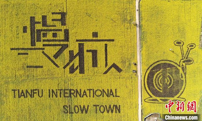 成都崇州市一处油菜花田里出现“慢城”字样和一只“蜗牛”图案。 刘忠俊 摄
