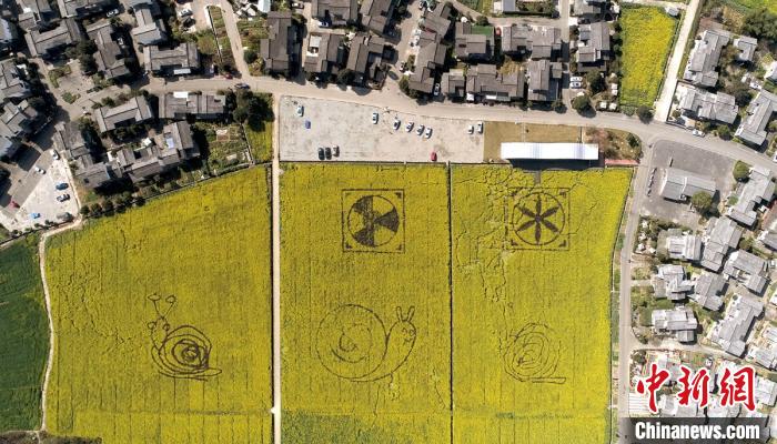 成都崇州市一处油菜花田里出现“蜗牛”等图案。 刘忠俊 摄