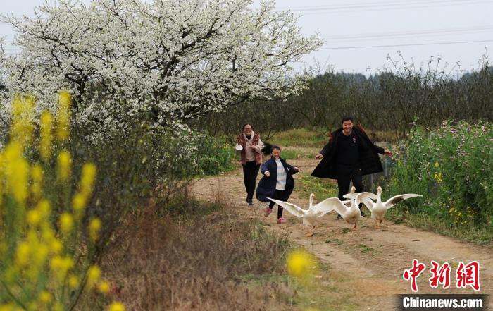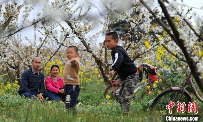 眉山市东坡区太和镇四维村一果园里,孩子们在李花树下开心玩耍。 刘忠俊 摄