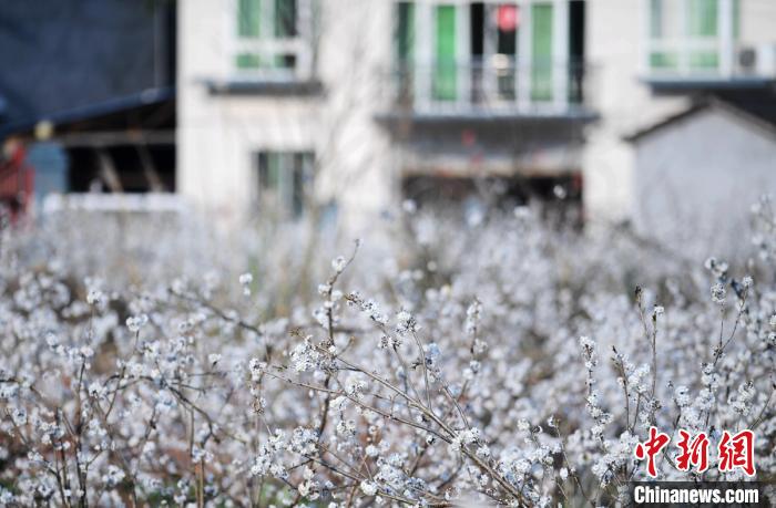 仁寿县一优质果园里盛开的樱桃花与远处的民房。 刘忠俊 摄