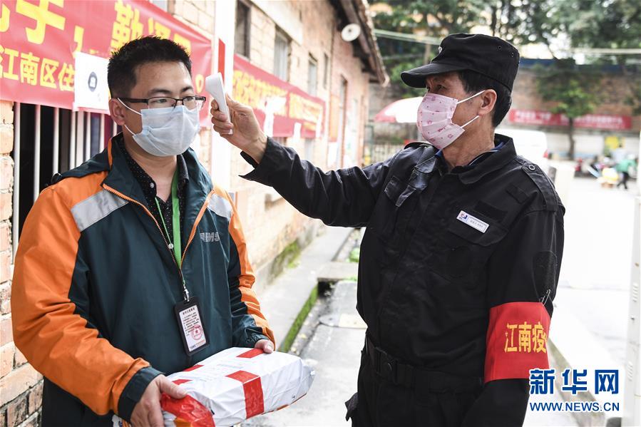 3月3日,广西南宁市邮政部门的工作人员在配送教材学习资料过程中接受体温检测。 近期,广西邮政部门在做好新冠肺炎疫情防控工作的同时,主动优化快递收揽、派送流程,降低配送费用、与中小学校对接,将新学期的学习资料及时邮寄到学生手中。 截至3月2日,广西邮政部门已为全自治区14个市60多所中小学校的7.9万名在校学生配送了教材和教辅类书籍。 新华社记者 曹祎铭 摄