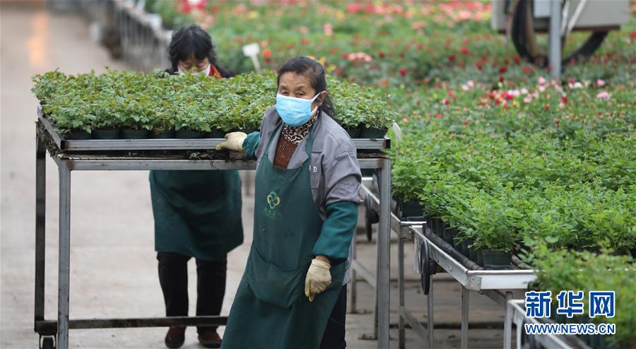 3月3日,工人在海城市三星生态农业有限公司花卉大棚内搬运花苗。复工复产以来,这个企业开启了花卉网络销售和手机终端销售。 近日,辽宁海城多家农业公司积极带领农户在设施大棚内复产复工,并开启网络销售模式,设施大棚内一片繁忙景象。 新华社记者 姚剑锋 摄