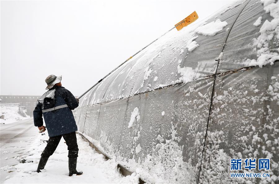 3月3日,海城市迎来较强降雪,为了避免积雪压塌设施大棚,一名三星生态农业有限公司工人在处理积雪。 近日,辽宁海城多家农业公司积极带领农户在设施大棚内复产复工,并开启网络销售模式,设施大棚内一片繁忙景象。 新华社记者 姚剑锋 摄