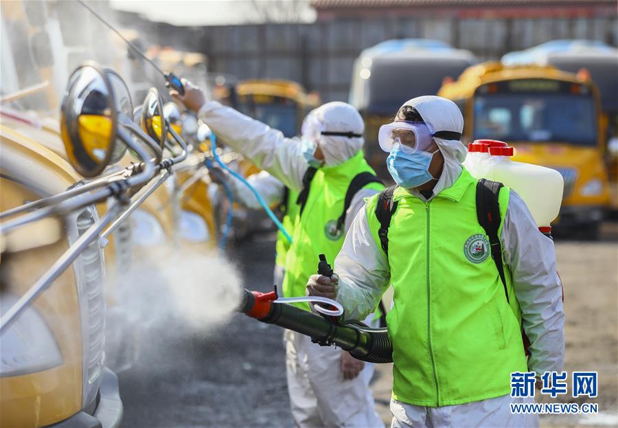 3月4日,滕州市环保志愿者正在为校车消毒。 山东省滕州市环保志愿者对滕州市交运公司所属营运的1000余辆公交车、校车、出租车等客运车辆进行全面义务清洗消毒,为道路客运恢复运营创造清洁安全的乘车环境。 新华社发(宋海存 摄)