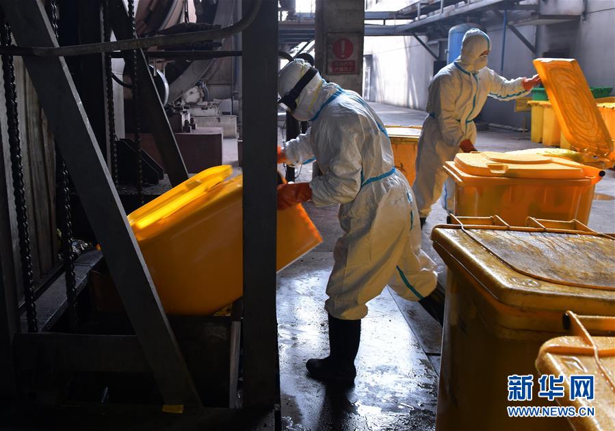 3月4日,在武汉市青山区云峰公司,工作人员将医疗垃圾投入斗提机进行焚烧。 新华社记者 李贺 摄