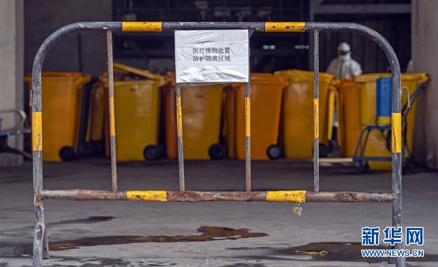 3月4日,在武汉市青山区云峰公司,工作人员在对医疗废物转运箱消毒。新华社记者 才扬 摄