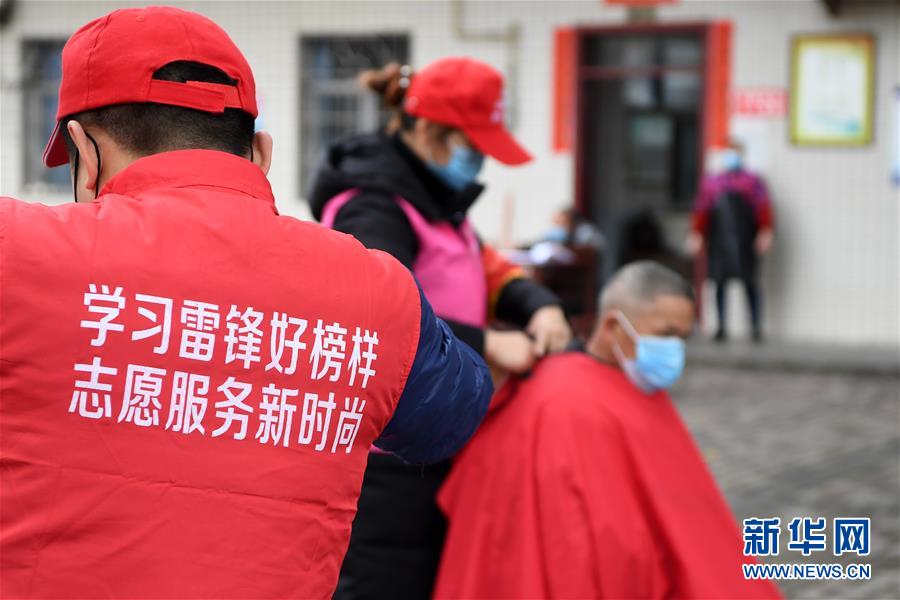 3月5日,志愿者在敬老院为老人义务理发。 当日,重庆市綦江区古南街道双桥社区组织辖区内在职党员和志愿者开展学雷锋志愿活动,为街道中心敬老院的老人提供义务理发、打扫卫生等服务。 新华社记者 唐奕 摄