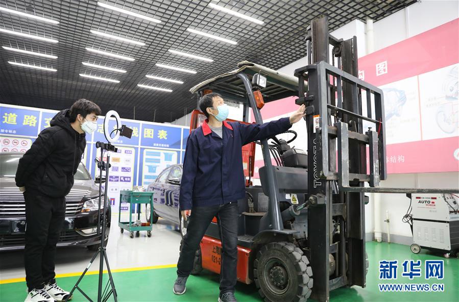 3月4日,职教城内的鞍山市交通运输学校的杨永祥老师(右)为学生进行物流叉车实训网络授课。 辽宁省鞍山市职教城内的各类职业教育学校从3月2日恢复网络授课以来,教师们设置了丰富多彩的课程,提高1万余名学生线上学习的积极性。 新华社记者 姚剑锋 摄