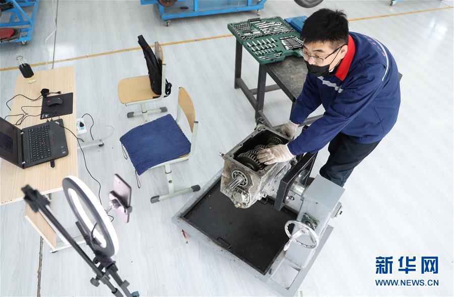 3月4日,职教城内的鞍山市交通运输学校的高峰老师为学生进行变速器检修实训网络授课。 辽宁省鞍山市职教城内的各类职业教育学校从3月2日恢复网络授课以来,教师们设置了丰富多彩的课程,提高1万余名学生线上学习的积极性。 新华社记者 姚剑锋 摄