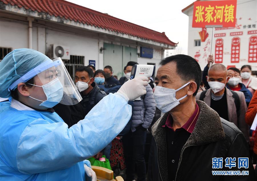 3月5日,勉县火车站工作人员对乘坐“定制火车”的务工人员进行体温检测。 新华社记者陶明摄