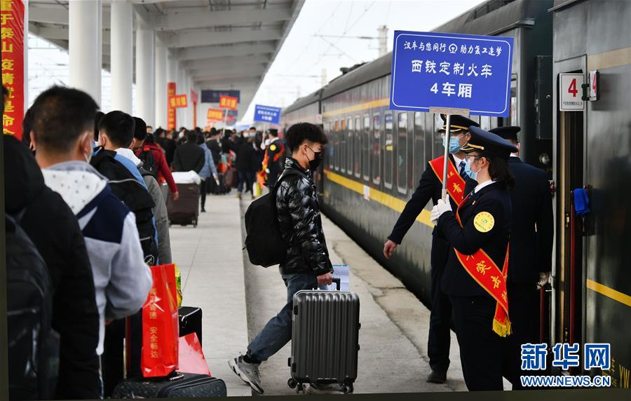 3月5日,来自勉县各乡镇的务工人员乘坐由政府统一安排的免费“定制火车”前往苏沪地区。 新华社记者陶明摄