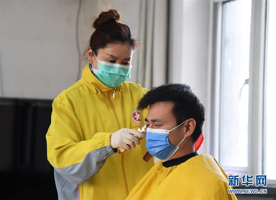 3月5日,青龙桥街道义务理发队成员雷衡美(左)在为北京市海淀区医学救援中心护理科护士吕逍理发。 3月5日是学雷锋纪念日,北京市海淀区青龙桥街道义务理发队的成员来到北京市海淀区医学救援中心,在做好防疫安全的前提下,为医护人员提供义务理发服务。 新华社记者 任超 摄
