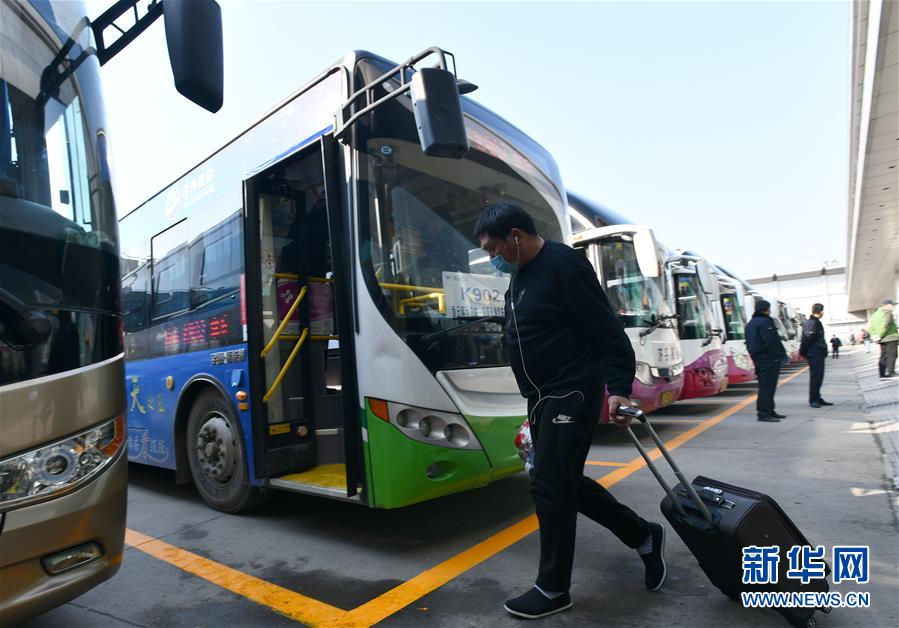 3月5日,在济南长途汽车总站,旅客准备上车。 当日,在充分做好疫情防控工作的前提下,山东省恢复开通并逐步增加始发地和目的地均在省内低风险县(市、区)且不途经中风险县(市、区)的班线客运、农村客运,恢复相关汽车客运站运营。对目前为中风险地区的市际班线及省际班线视疫情情况逐步有序恢复。 新华社记者朱峥摄