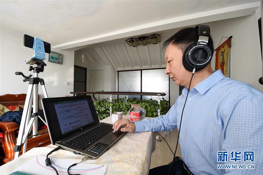 3月5日,呼和浩特市第十六中学高三物理教师呼斯楞通过网络课堂与学生在线互动。新华社记者 彭源 摄