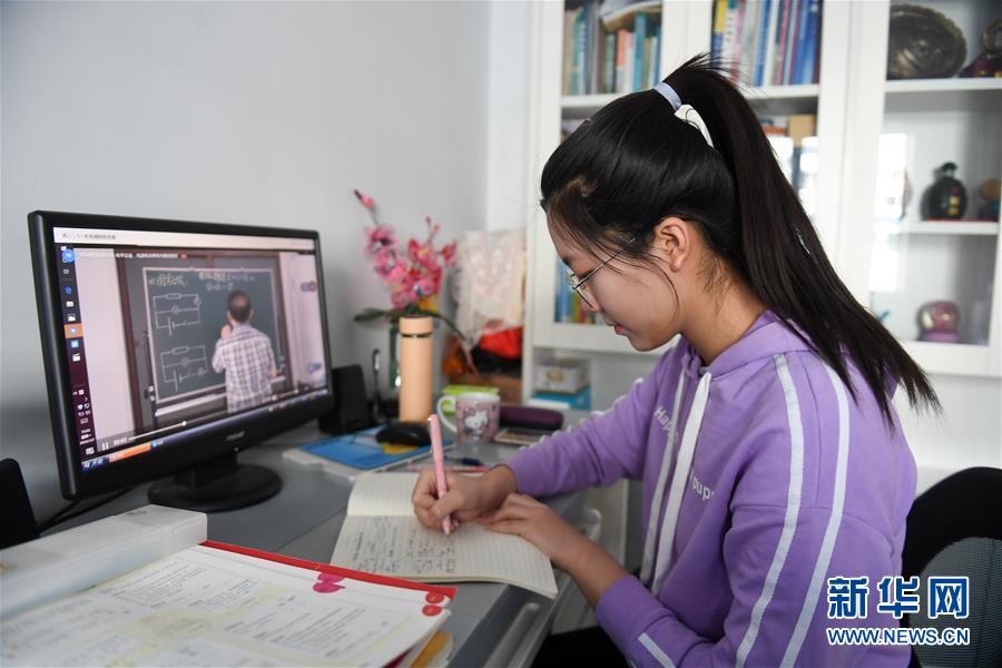 3月5日,呼和浩特市第十六中学高三学生孙靓瑶在家中观看线上教学视频。新华社记者 彭源 摄