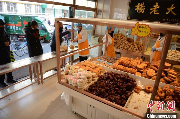 3月5日,呼和浩特市一老字号店铺前,人们排队购买焙子等干货食品。 刘文华 摄