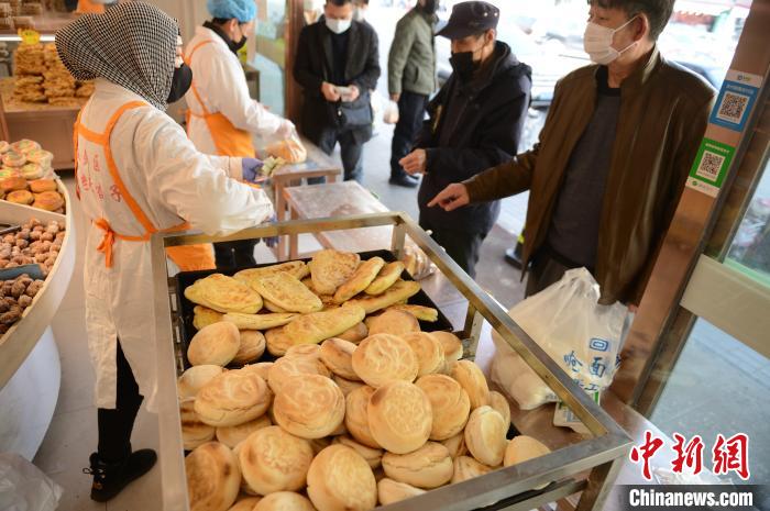 3月5日,呼和浩特市一老字号店铺前,刚出锅的焙子即将售卖。 刘文华 摄