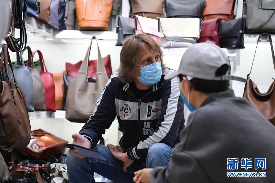 3月5日,外国采购商在广州中港皮具城洽谈业务。 近日,广州市一批专业批发市场在做好疫情防控的同时,开始有序恢复营业。 新华社记者 邓华 摄