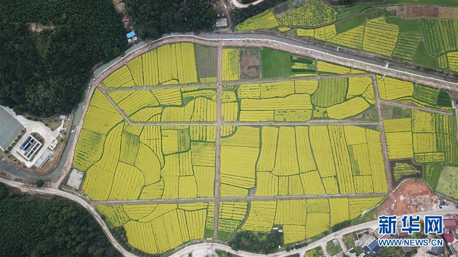 这是位于湖南省浏阳市葛家镇的油菜花田(3月5日摄无人机照片)。 当日是惊蛰,湖南省各地农民抓住农时,开展农业生产。 新华社发(陈振海 摄)