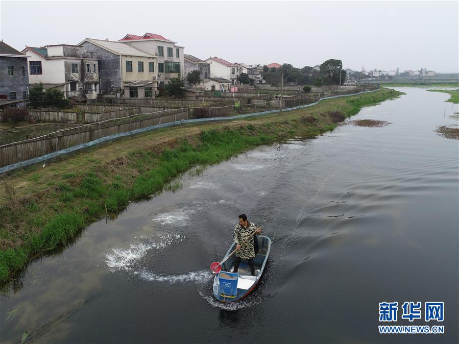 3月5日,湖南省长沙市望城区乔口镇田心坪村的虾农在给虾苗喂食(无人机照片)。 当日是惊蛰,湖南省各地农民抓住农时,开展农业生产。 新华社记者 薛宇舸 摄