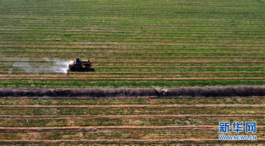 3月5日,在山东省蓬莱市北沟镇泊子村麦田,农机手在进行植保作业(无人机照片)。 当日是二十四节气中的惊蛰,各地农民抢抓农时,田间地头呈现繁忙景象。 新华社发(于良意 摄)