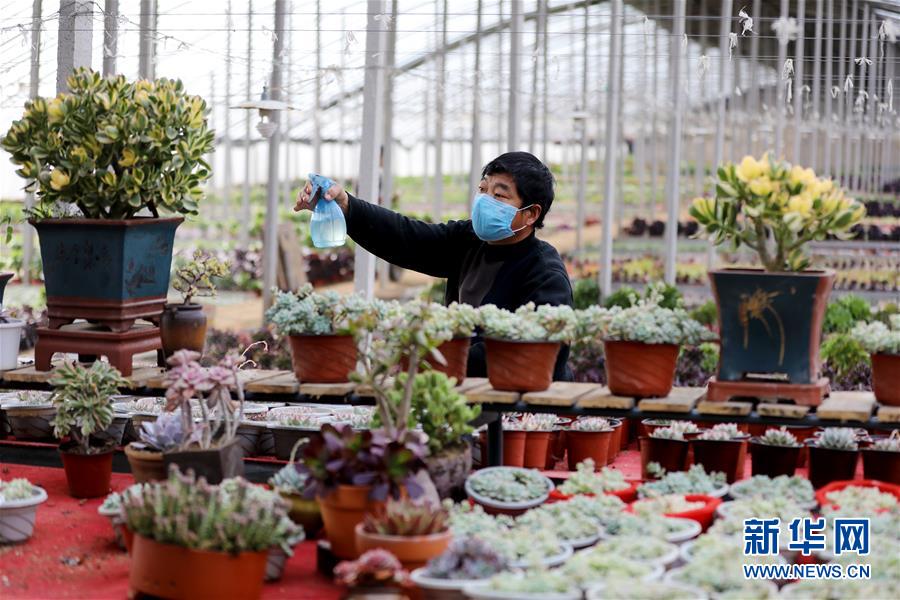 3月5日,农民在河北省衡水市桃城区邓庄镇一处花卉大棚内给多肉植物浇水。 近日,河北省衡水市桃城区在做好疫情防控的同时,组织农民依靠设施大棚有序开展农业生产,保障农产品市场供应。 新华社记者 牟宇 摄