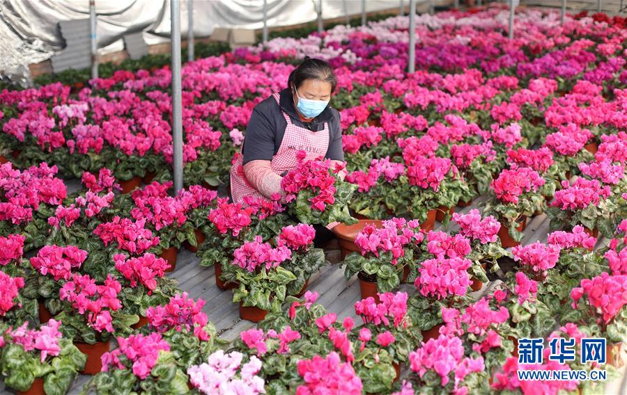 3月5日,农民在河北省衡水市桃城区邓庄镇一处花卉大棚内打理种植的鲜花。 近日,河北省衡水市桃城区在做好疫情防控的同时,组织农民依靠设施大棚有序开展农业生产,保障农产品市场供应。 新华社记者 牟宇 摄