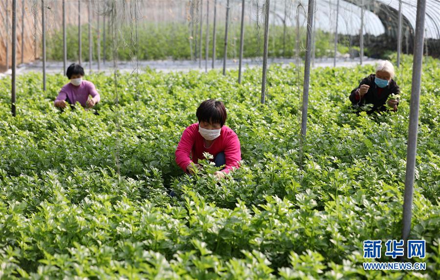 3月5日,农民在河北省衡水市桃城区邓庄镇一处蔬菜大棚内给种植的芹菜除草。 近日,河北省衡水市桃城区在做好疫情防控的同时,组织农民依靠设施大棚有序开展农业生产,保障农产品市场供应。 新华社记者 牟宇 摄