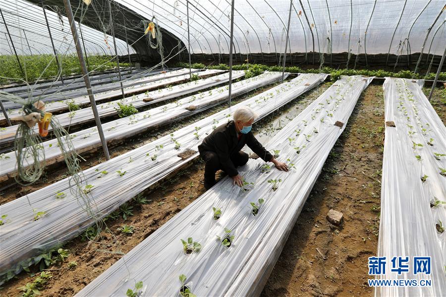 3月5日,农民在河北省衡水市桃城区邓庄镇一处育苗大棚内劳作。 近日,河北省衡水市桃城区在做好疫情防控的同时,组织农民依靠设施大棚有序开展农业生产,保障农产品市场供应。 新华社记者 牟宇 摄