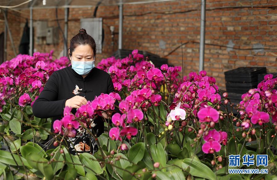 3月5日,农民在河北省衡水市桃城区邓庄镇一处花卉大棚内打理种植的鲜花。 近日,河北省衡水市桃城区在做好疫情防控的同时,组织农民依靠设施大棚有序开展农业生产,保障农产品市场供应。 新华社记者 牟宇 摄