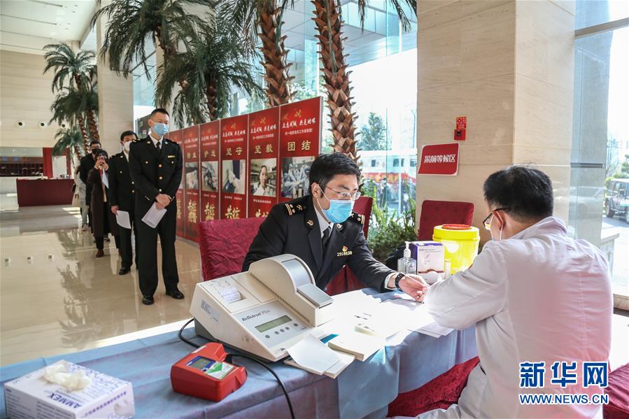 3月5日,杭州海关青年关员在进行献血前体检。 当日是学雷锋纪念日,杭州海关组织青年关员参加无偿献血活动,以实际行动学习雷锋,奉献爱心。 新华社发(江汉 摄)
