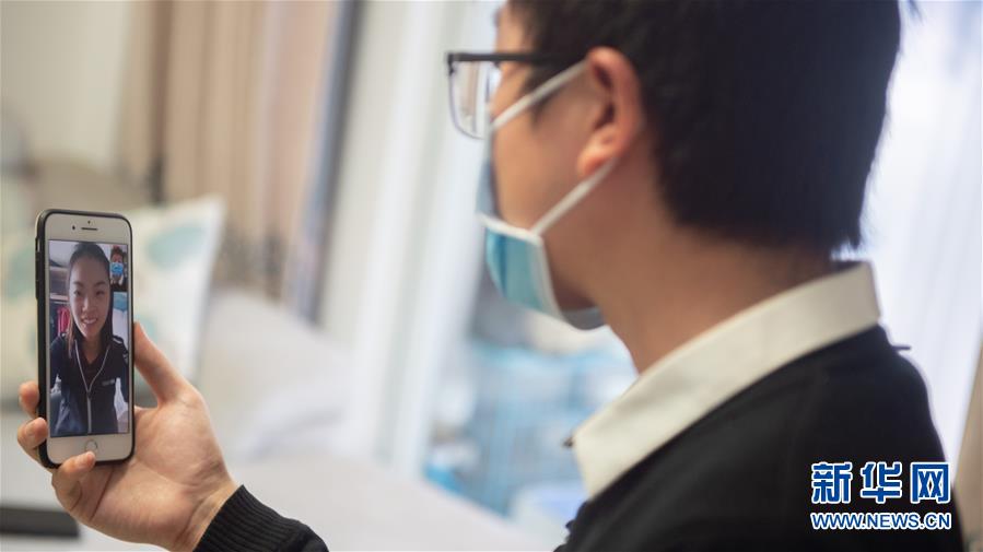 3月5日,胡馨玥(手机中正在视频连线)与男友胡开泽视频通话。 新华社发(张丽芸 摄)