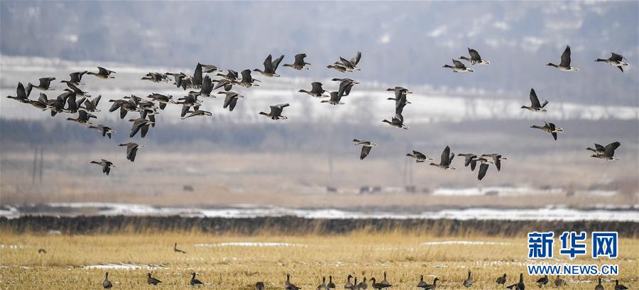 这是在珲春敬信湿地拍摄的大雁(3月3日摄)。 吉林省珲春市敬信湿地位于中澳、中日两条候鸟迁徙路线交会处。这里江河贯穿,湖泡连片,动植物资源十分丰富,被誉为候鸟迁徙的“五星级驿站”。 为保障候鸟在敬信湿地逗留期间的安全,珲春森林公安局基层民警奋战在护鸟一线,积极加大巡护力度,在风雪天气为候鸟投放粮食,严打猎捕候鸟违法犯罪,确保候鸟迁徙通道安全。 新华社记者 许畅 摄