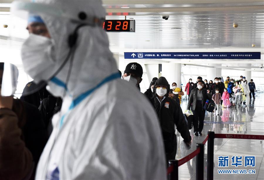 3月5日,青岛流亭国际机场,入境旅客走出廊桥排队等候体温测量。 为严防疫情输入风险,山东省青岛市在机场等入境口岸加强了防控措施、风险评估和口岸检疫。 新华社记者 李紫恒 摄