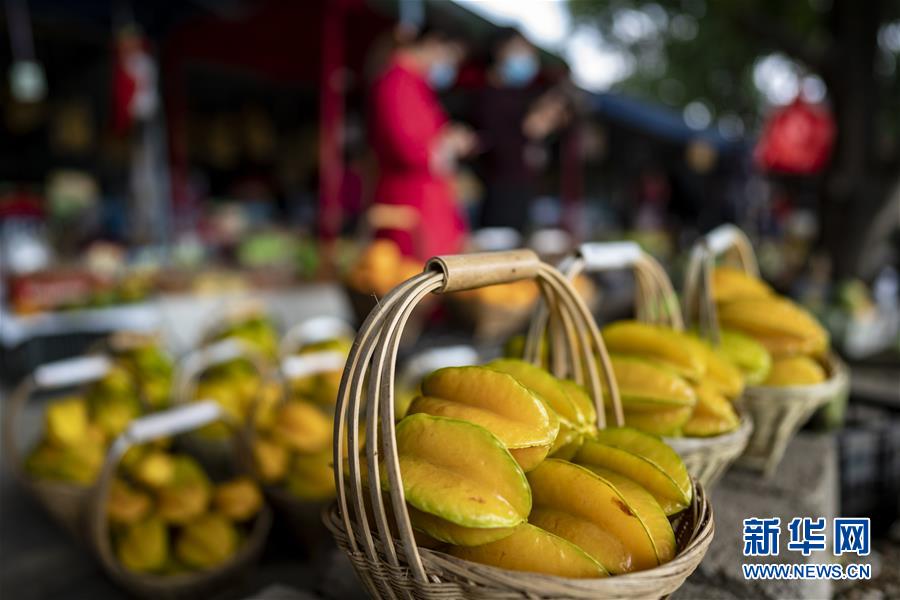 云南省元江县市场上待售的杨桃(3月5日摄)。 元江哈尼族彝族傣族自治县位于云南省玉溪市南部的红河谷盆地,享有“彩云之南花果园”的美誉。近年来,当地充分利用气候优势,加快发展热区特色农业产业,一年四季都有花果源源不断销往全国各地。 新华社记者江文耀摄