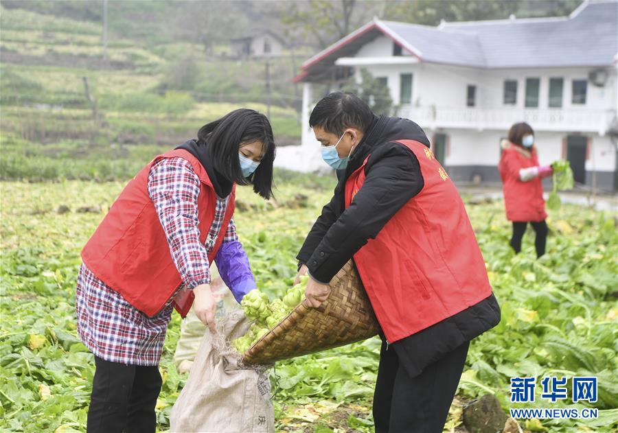重庆市涪陵区江北街道志愿者在二渡村帮农户采收蔬菜(2月13日摄)。新华社记者 王全超 摄