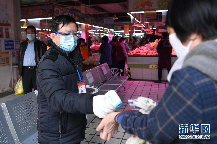 3月6日,工作人员对进入兰州市榆中街菜市场的市民测量体温。 近日,在严格落实新冠肺炎防控要求的前提下,甘肃省兰州市65家标准化菜市场已全部恢复营业,以保障市民“菜篮子”供应。 新华社记者 陈斌 摄