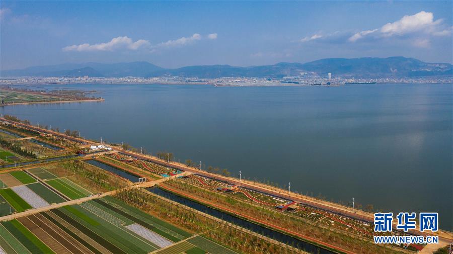 这是玉溪市通海县的杞麓湖与周边风光(3月4日摄,无人机照片)。 杞麓湖位于云南省玉溪市通海县境内。近年来,为保护杞麓湖生态环境,通海县大力实施环湖截污治污工程建设、污水处理厂及管网配套建设、湖滨生态湿地修复、入湖河道生态治理等措施,水质有所改善。 新华社记者 胡超 摄