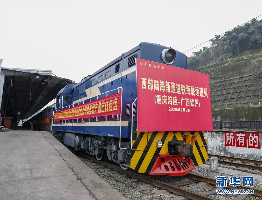 3月6日,重庆涪陵—广西钦州铁海联运货运专列从涪陵西站驶出。 当日,满载50个20尺集装箱的“陆海新通道”新开重庆涪陵首发铁海联运货运专列(重庆涪陵—广西钦州)在重庆涪陵西站发车。 新华社发(黄伟 摄)