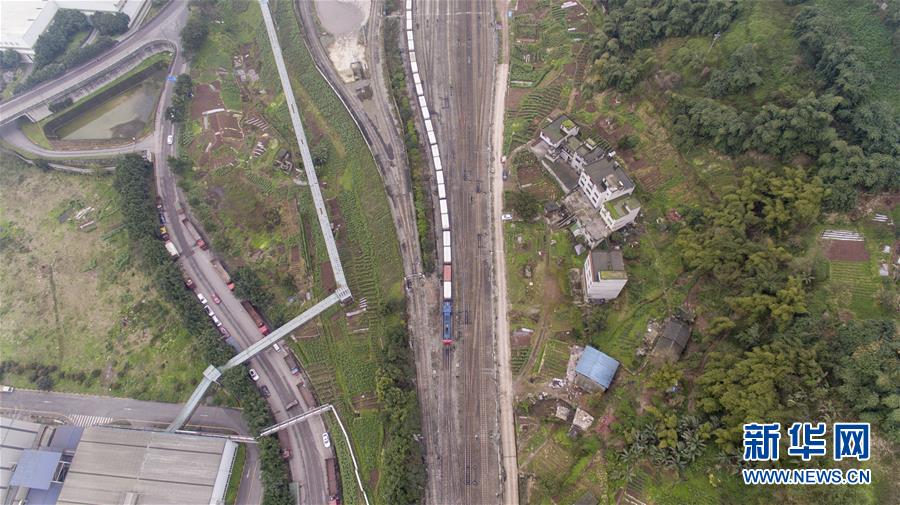 3月6日,重庆涪陵—广西钦州铁海联运货运专列从涪陵西站驶出(无人机照片)。 当日,满载50个20尺集装箱的“陆海新通道”新开重庆涪陵首发铁海联运货运专列(重庆涪陵—广西钦州)在重庆涪陵西站发车。 新华社发(黄伟 摄)