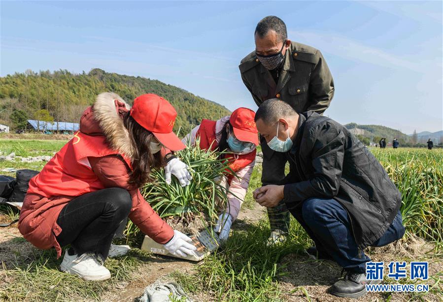 3月6日,志愿者在余姚市三七市镇相岙村帮助种植户给青蒜称重,以便进行打包义卖。 当日,浙江省余姚市大城小爱公益服务中心的志愿者来到余姚市三七市镇相岙村,帮助种植户对青蒜进行抢收、义卖和网上销售。 新华社记者 徐昱 摄
