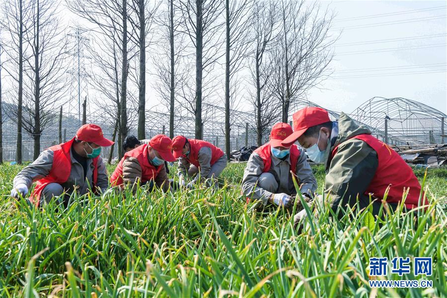 3月6日,志愿者在余姚市三七市镇相岙村帮助种植户抢收青蒜。 当日,浙江省余姚市大城小爱公益服务中心的志愿者来到余姚市三七市镇相岙村,帮助种植户对青蒜进行抢收、义卖和网上销售。 新华社记者 徐昱 摄