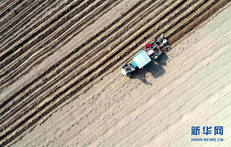3月6日,任县后安庄村农民使用农机在田间播种土豆(无人机照片)。 近日,随着气温回升,河北省邢台市任县农民抢抓农时开展农业生产,田间地头一派农忙景象。 新华社记者 朱旭东 摄