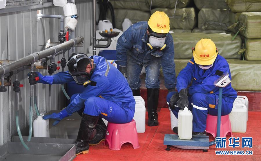 3月6日,在位于重庆市长寿经开区的映天辉氯碱化工有限公司,工作人员在消毒液灌装车间内作业。新华社记者 王全超 摄